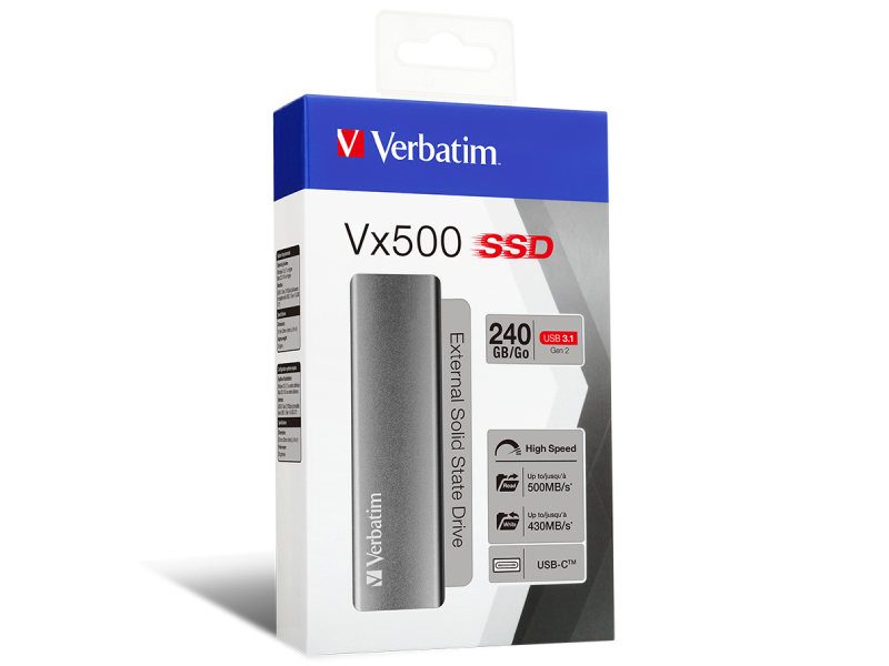 M.2 External SSD 240GB Verbatim Vx500 USB 3.1 Gen 2, Sequential Read/Write: up to 500/430 MB/s, Windows®, Mac, PS4 and Xbox One compatible, Light, Portable, Durable, Ultra-compact aluminum housing