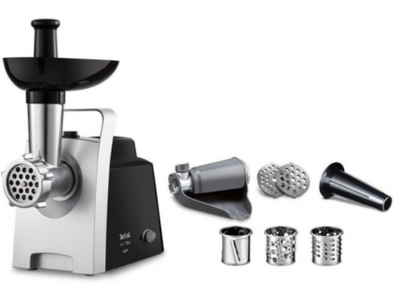 Etichete: Meat Mincer Tefal NE108831, 1600W power output, 3 perforated discs, 2 grating and slicing attachments, grinding speed 1, 9kg / min, white